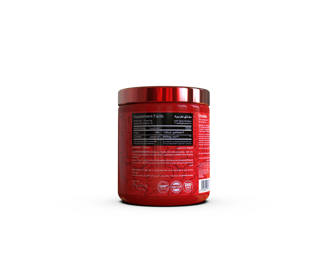 وتوضح الصور الخلفية المرفقة أن المنتج يعتمد على L-Citrulline كمكوّن أساسي في التركيبة.